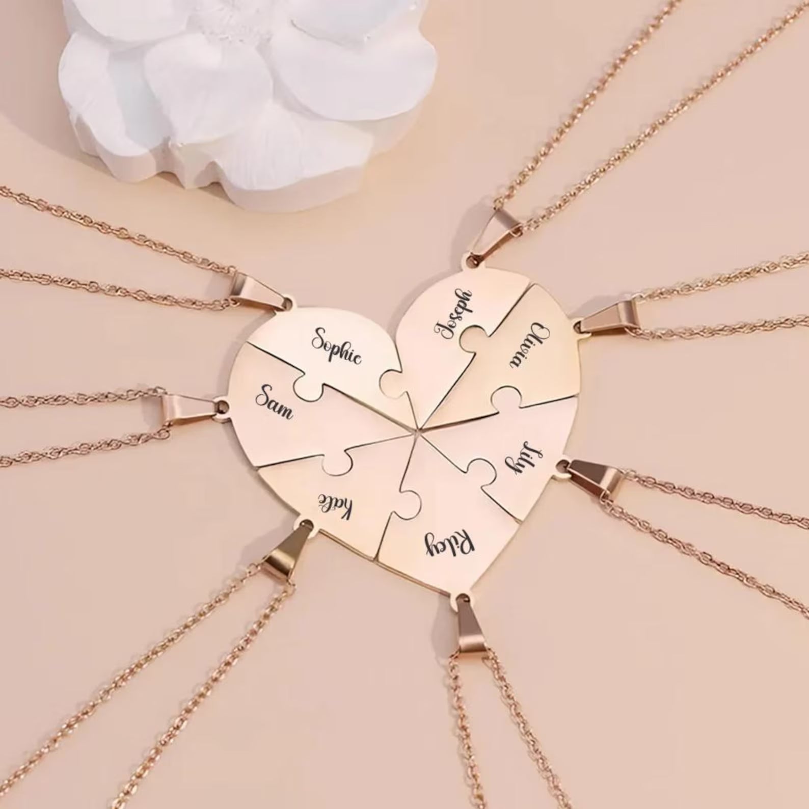 Un bijou composé de pièces puzzle gravées qui s’emboîtent, idéal pour symboliser un lien (famille, couple, amis).